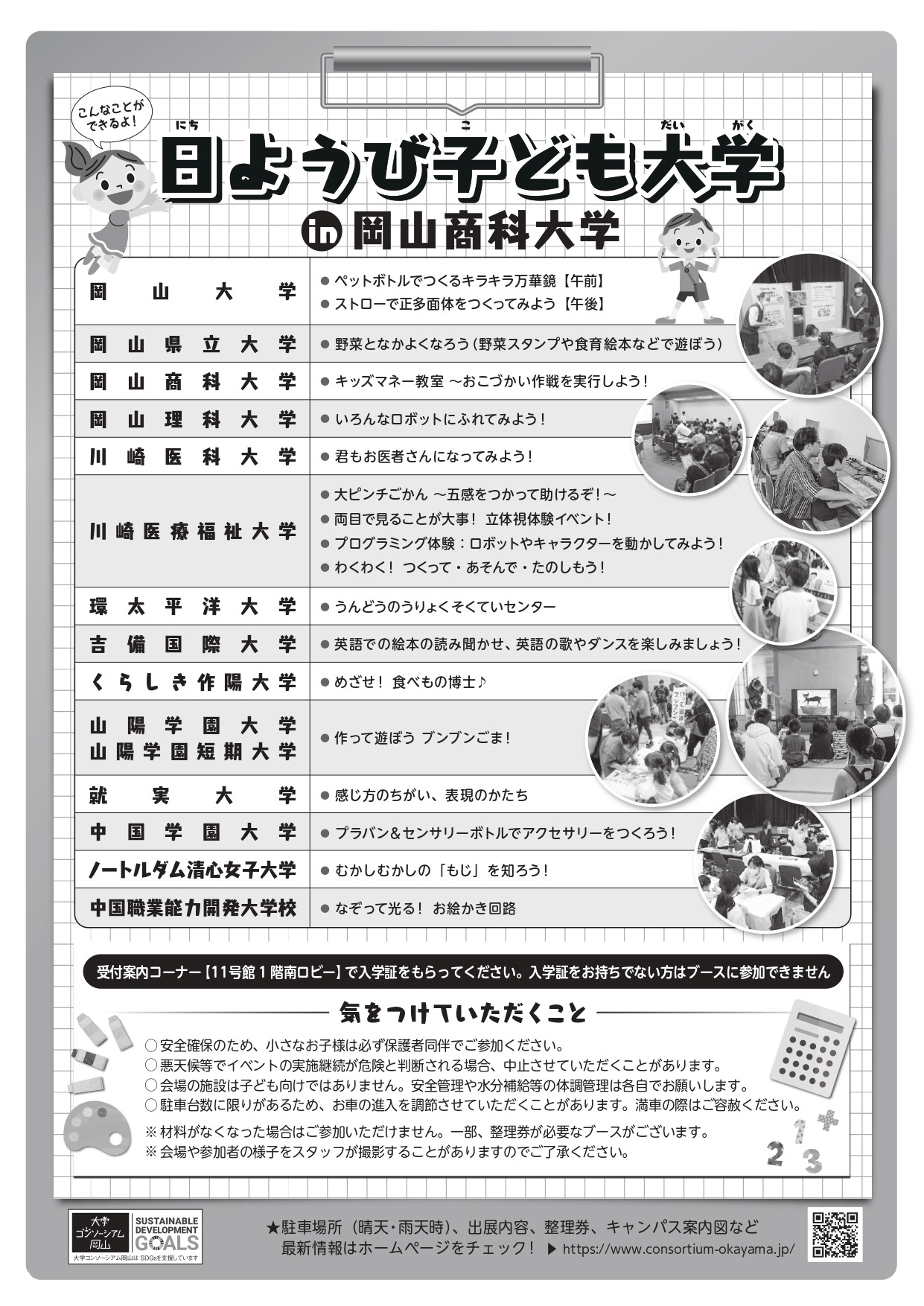 岡山商科大学にて、岡山県内15大学がそれぞれの教育研究活動を集約して行われるイベント「日ようび子ども大学」が開催されます。様々なことを実際に体験して、楽しみながら学べるイベントです。