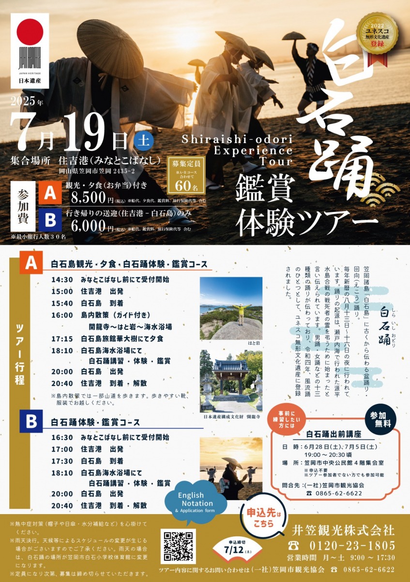 お囃子にあわせて踊る全国各地の民俗芸能「風流踊」のひとつとしてユネスコの無形文化遺産に登録されている「白石踊」を体験できるツアー。白石踊発祥の地・白石島で、夕日をバックに衣装をまとい、踊る姿を見られる貴重な機会です。ツアー当日は白石踊りの鑑賞・体験のほかにも、島内散策や現地の島宿のお弁当など、盛りだくさんの内容です。