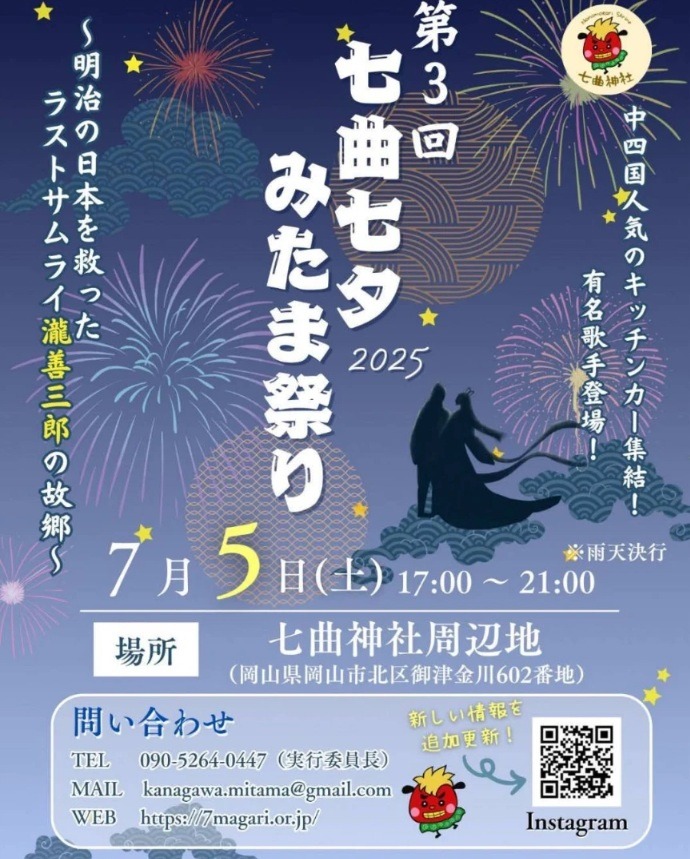 岡山市の御津金川という地区には、戦国武将松田氏が築き「西備前一の堅城」とうたわれた玉松城(金川城)がありましたが、1568年7月7日、宇喜多家によって滅ぼされました。落城後は長い間七夕が祝われることはなかったのですが、2023年に「七曲七夕みたま祭り」として455年ぶりに七夕まつりが復活しました。
