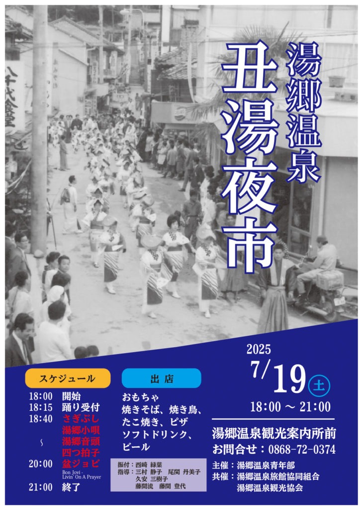 湯郷温泉で開催される夏まつり。土用の丑の日に温泉に浸かると、1年間無病息災、元気に暮らせるという言い伝えがあり、湯郷温泉では欠かせない行事となっています。会場ではテント村などが並び賑わいます。「さぎぶし」や「湯郷音頭」にあわせて踊りが披露されます。