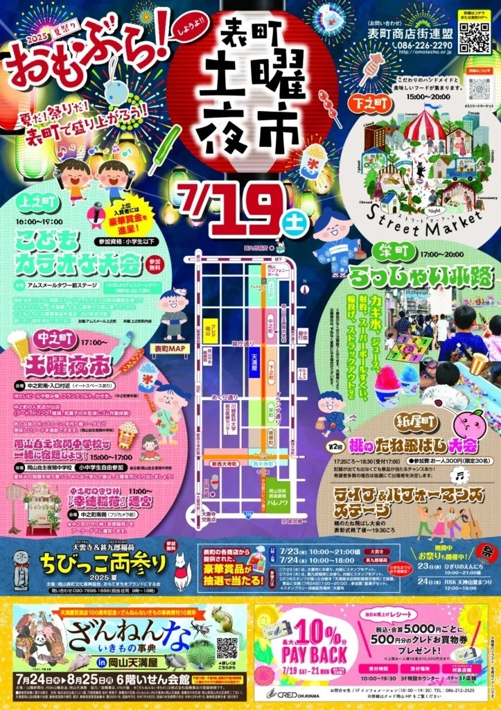 表町商店街の上之町・中之町・下之町・栄町・紙屋町にて「表町土曜夜市」が開催されます。長いアーケード街一帯に出店がずらりと並び、フード屋台をはじめ、くじ引きや輪投げといった子どもに人気の遊びも楽しむことができます。ほかにも様々なイベントが盛りだくさん。