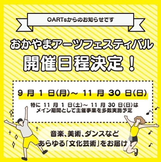 おかやまアーツフェスティバルは、2023年に新たに誕生した、音楽、美術、舞台芸術、伝統芸能、文芸など、ジャンルの垣根を超えた総合文化芸術の祭典です。「文化芸術都市・岡山」を目指して、岡山の街をあらゆる文化芸術=ARTSで彩り、市民のみなさまへ届けします。