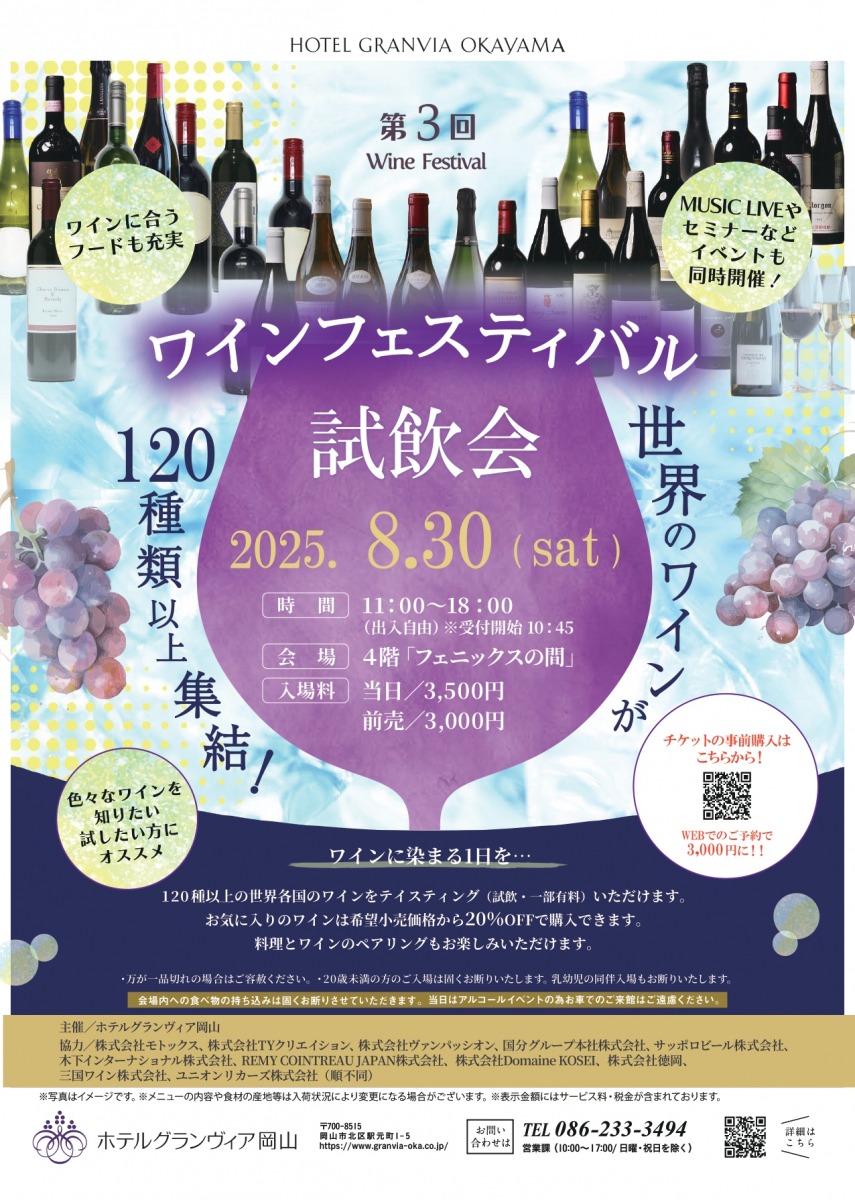岡山駅前に立つ街のランドマークホテルグランヴィア岡山にて「ワインフェスティバル」が開催されます。120種類以上のワインをテイスティング(試飲・一部有料)で味わえ、料理とワインのペアリングも楽しめます。さらに、Kisho(重田 喜生)によるミュージックライブや、「グランポレールの魅力と新たな挑戦」と題した 醸造家によるワインセミナー(有料、先着限定20名)も実施。ワインに染まる1日を心ゆくまで堪能できます。