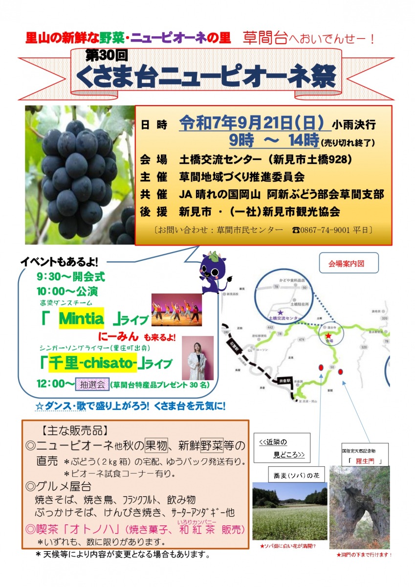 草間地域の秋の特産品であるニューピオーネの直売を行う「くさま台ニューピオーネ祭」が開催されます。当日は、ニューピオーネを始めとしたぶどうの直売の他、新鮮な秋野菜の販売、グルメ屋台などが出店。ステージイベントも行われます。草間台の喫茶「オトノハ」による焼菓子、和紅茶の販売もあります。