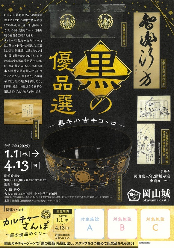岡山城にちなんで黒をテーマにしたイベント「黒の優品選」が開催されます。岡山城の黒の優品が紹介されます。