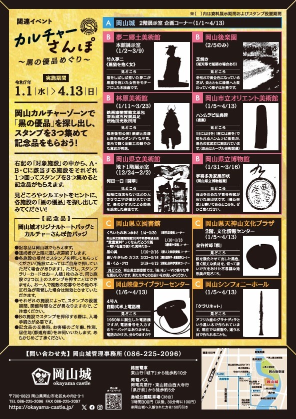 岡山カルチャーゾーンで「黒の優品」を探し出し、スタンプを3つ集めると記念品がもらえます。
