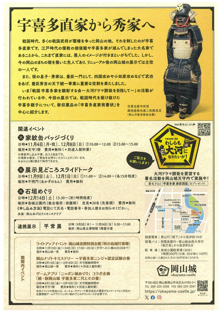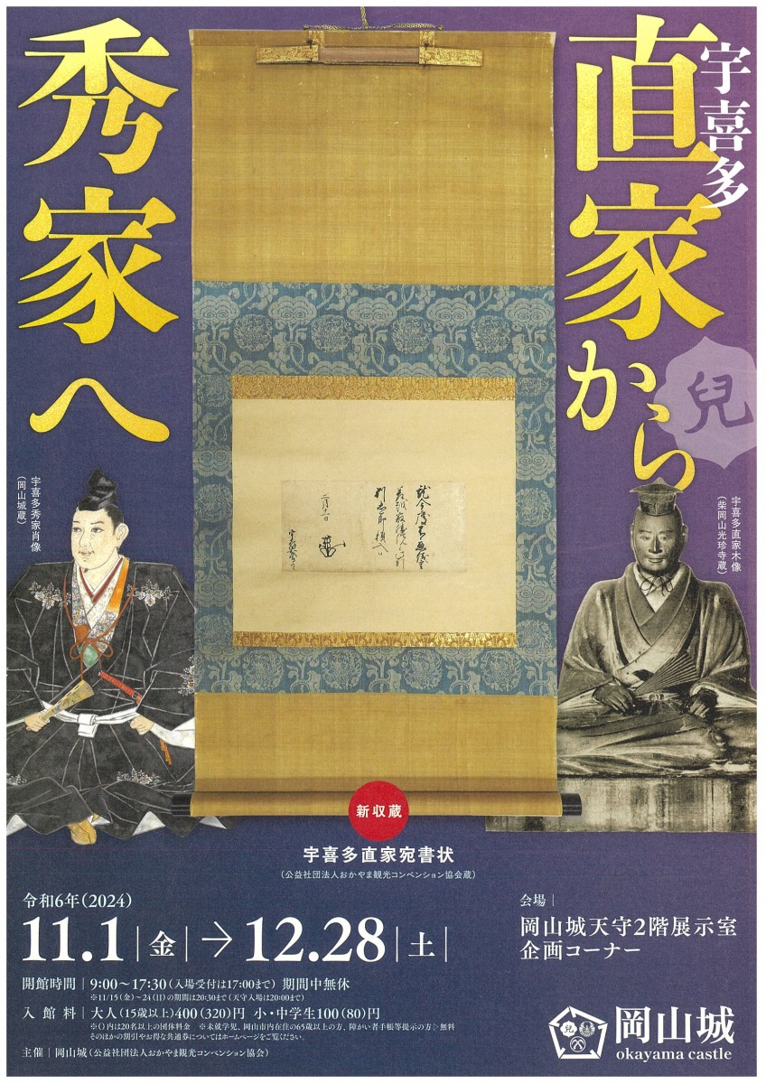 戦国時代、多くの戦国武将が覇権を争った岡山の地。それを制したのが宇喜多直家です。江戸時代の儒教の価値観や宇喜多家が滅んでしまった大名家であることから、これまで直家には、悪人のイメージが付きまといがちでした。しかし、今の岡山のまちの礎を築いた先人であり、リニューアル後の岡山城の展示では主役の一人です。また、彼の息子・秀家は、豊臣一門として、四国攻めや小田原攻めなどで武功をあげ、豊臣秀吉の天下統一に重要な役割を果たしました。 いま「戦国 宇喜多家を検証する会~大河ドラマ誘致を目指して~」の活動が行われている中、今回の展示では、戦国時代を駆け抜けた宇喜多親子について、新収蔵品の「宇喜多直家宛書状」を中心に紹介。