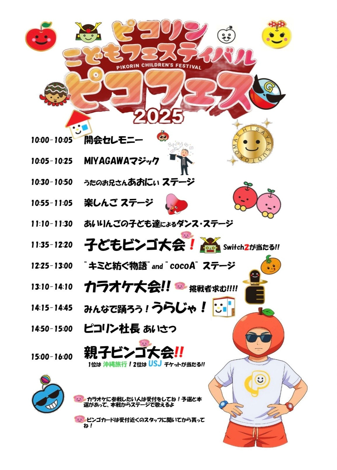 コンベックス岡山(大展示場)にて「ピコリンこどもフェスティバル」が開催されます。豪華賞品が当たるビンゴ大会が行われ、屋台グルメは50店舗出店します。 こども縁日やキッズスペースが設けられ、イベントステージではカラオケ大会や「うらじゃ」ダンスも予定されています。さらに、人気芸能人の楽しんごさんもゲスト出演。