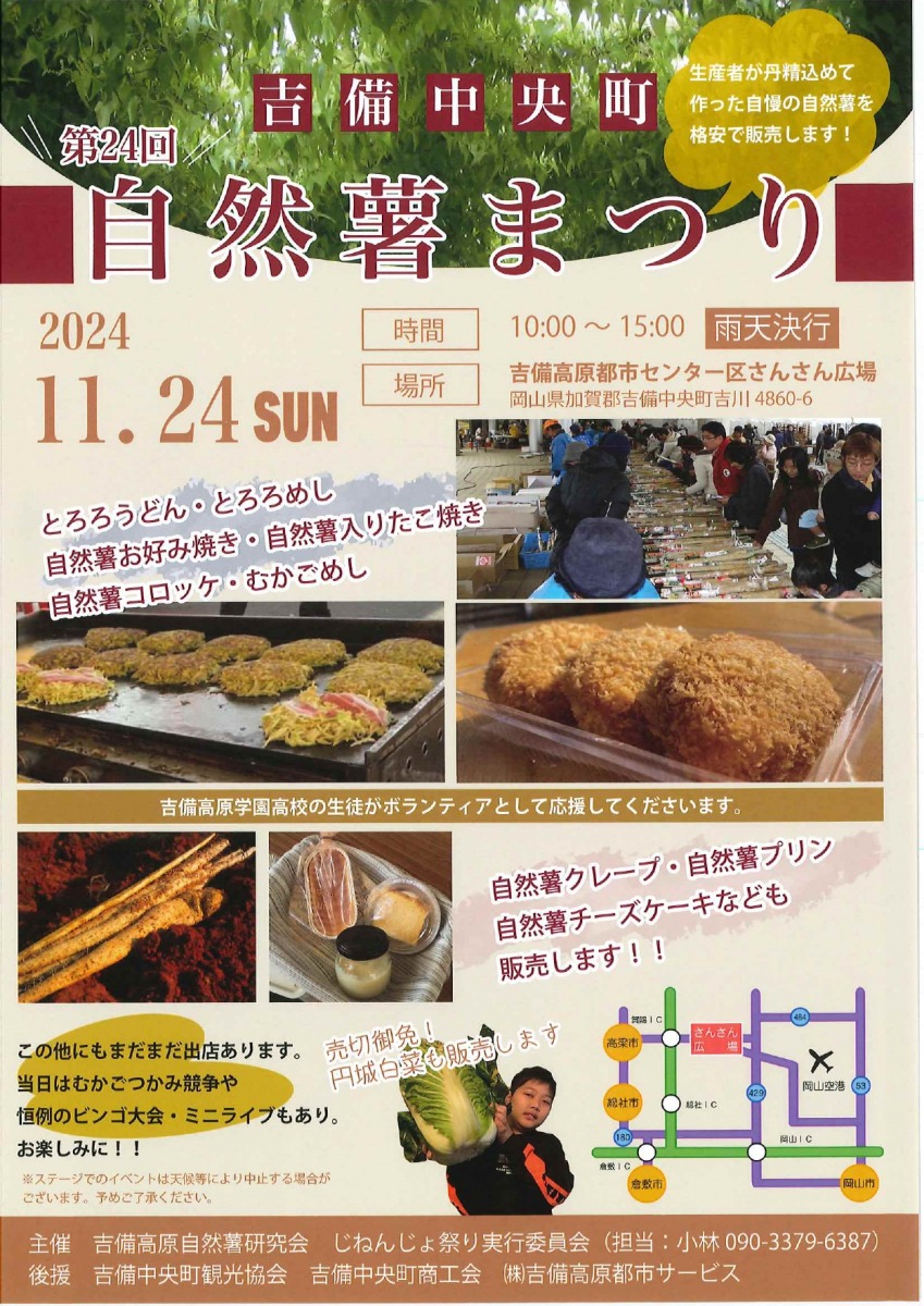 吉備中央町産の自然薯約1,000本が格安で販売されるお祭りが開催されます。吉備高原自然薯研究会が丹精込めて作った自慢の自然薯は、例年お昼前に完売するほどの美味しさです!会場内では、自然薯本来の味が楽しめるよう、その場ですりおろした「とろろうどん・とろろめし」をはじめ、「お好み焼き・たこ焼き」や「クレープ・プリン・チーズケーキ」など様々な自然薯グルメを味わうことができます。自然薯加工品や地元特産品「円城白菜」などの農産物も販売されます。