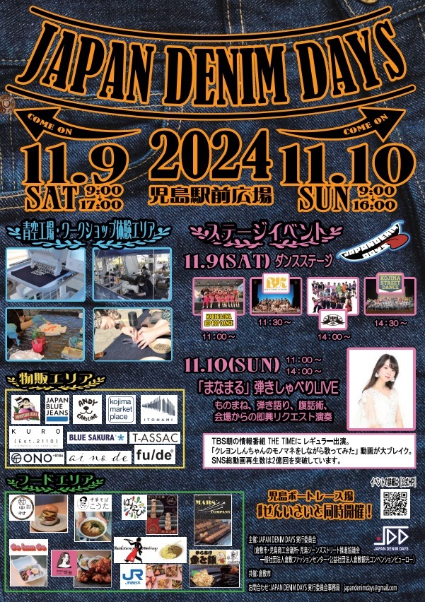 JR児島駅前広場にて、国内最大級の体験型デニムイベント「JAPAN DENIM DAYS」が開催されます。10(テン)月26(ニム)日のデニムの日にあわせ、職人の技術に触れる機会として加工体験に加え、企画体験としてオリジナルジーンズのオーダー(予約制)や、職人の中でも特に高い技術を持つ「繊維マイスター」の仕事を身近で見学できる青空工場も開催。家族で楽しめる無料企画体験・加工体験・グルメエリアも充実!
