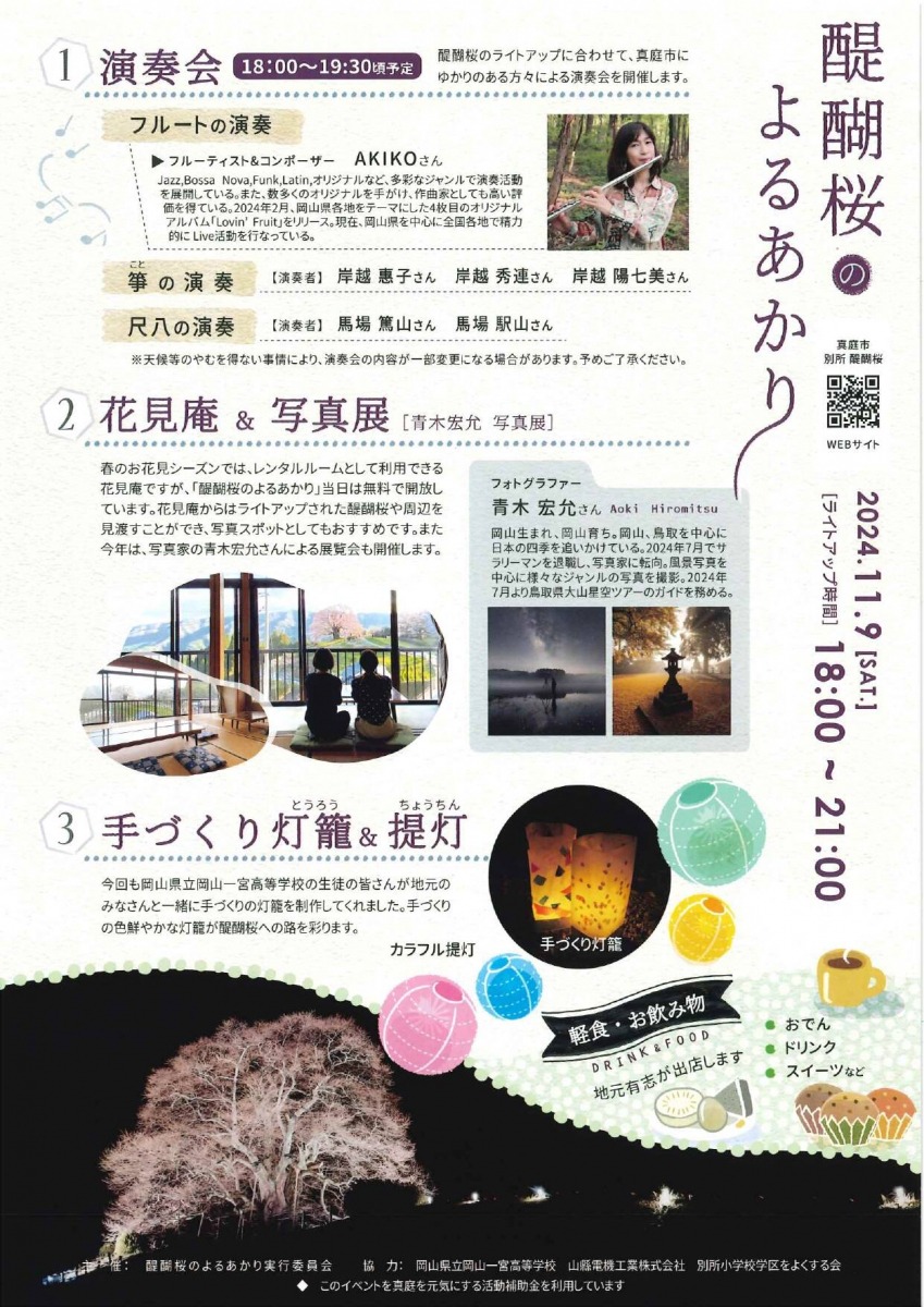 春のお花見シーズンでは、レンタルルームとして利用できる花見庵を無料で開放。花見庵からライトアップした醍醐桜や周辺を見渡すことができます。また、室内では写真家の青木宏允さんによる作品が展示されます。今回も岡山県立一宮高等学校の生徒の皆さんが地元の皆さんと一緒に手作りの灯籠を制作。色鮮やかな手づくり灯籠が醍醐桜への路を彩ります。
