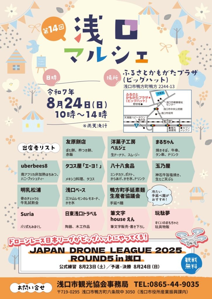ふるさとかもがたプラザ(ビッグハット)にて「浅口マルシェ」が開催されます。軽食やスイーツの販売、リラクゼーションなど、地元のお店がたくさん出店。