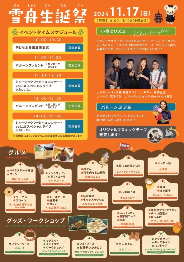 芝生エリアで、フードやドリンク、雑貨などを販売するマルシェやバルーンプレゼントなどが開催されるほか、子ども水墨画展の表彰式、Music Familleコンサートスペシャルライブも同時に開催されます。