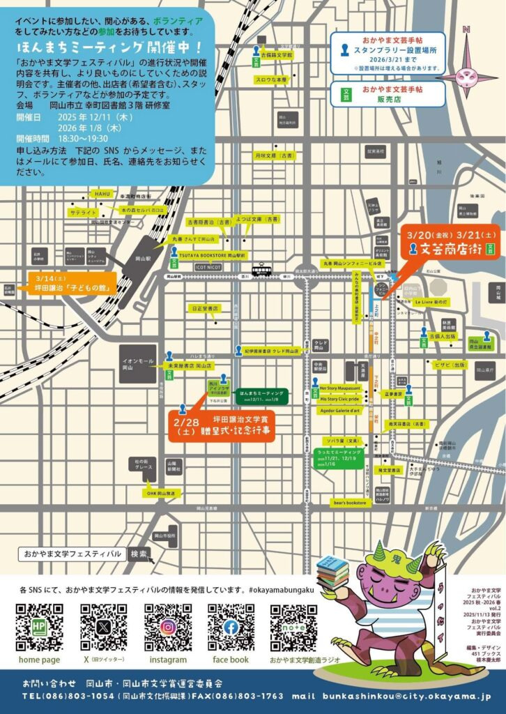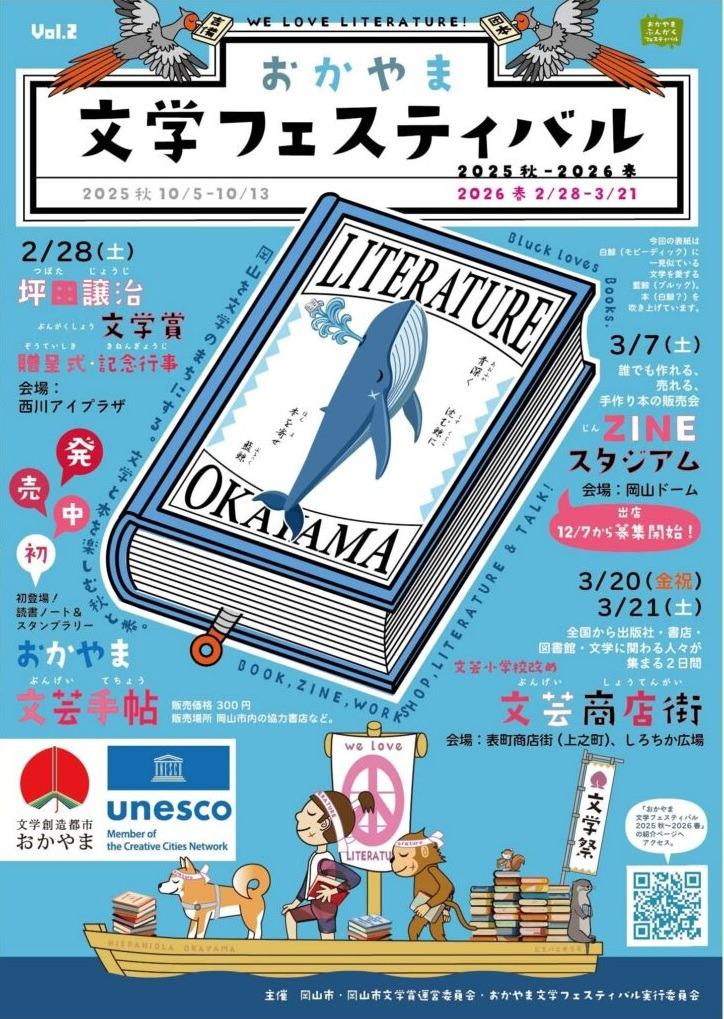 「文学による心豊かなまちづくり」に力を入れている岡山市では、2023年から毎年「おかやま文学フェスティバル」を開催。2026年2月28日から始まる 2026春会期では、自分で作った小冊子などの展示販売が行える「ZINE スタジアム」、県内外の書店・出版社・飲食店の出店、トークイベントやワークショップなどを行う「文芸商店街」など文学に関わるさまざまなイベントを岡山市内各地で開催されます。