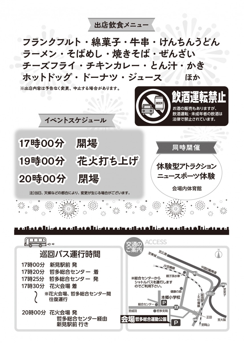 哲多総合運動公園にて、哲多の冬空が彩られる冬華火が開催されます。屋台やキッチンカーでは、そばめしやラーメン、焼き鳥などをお楽しみいただけます。