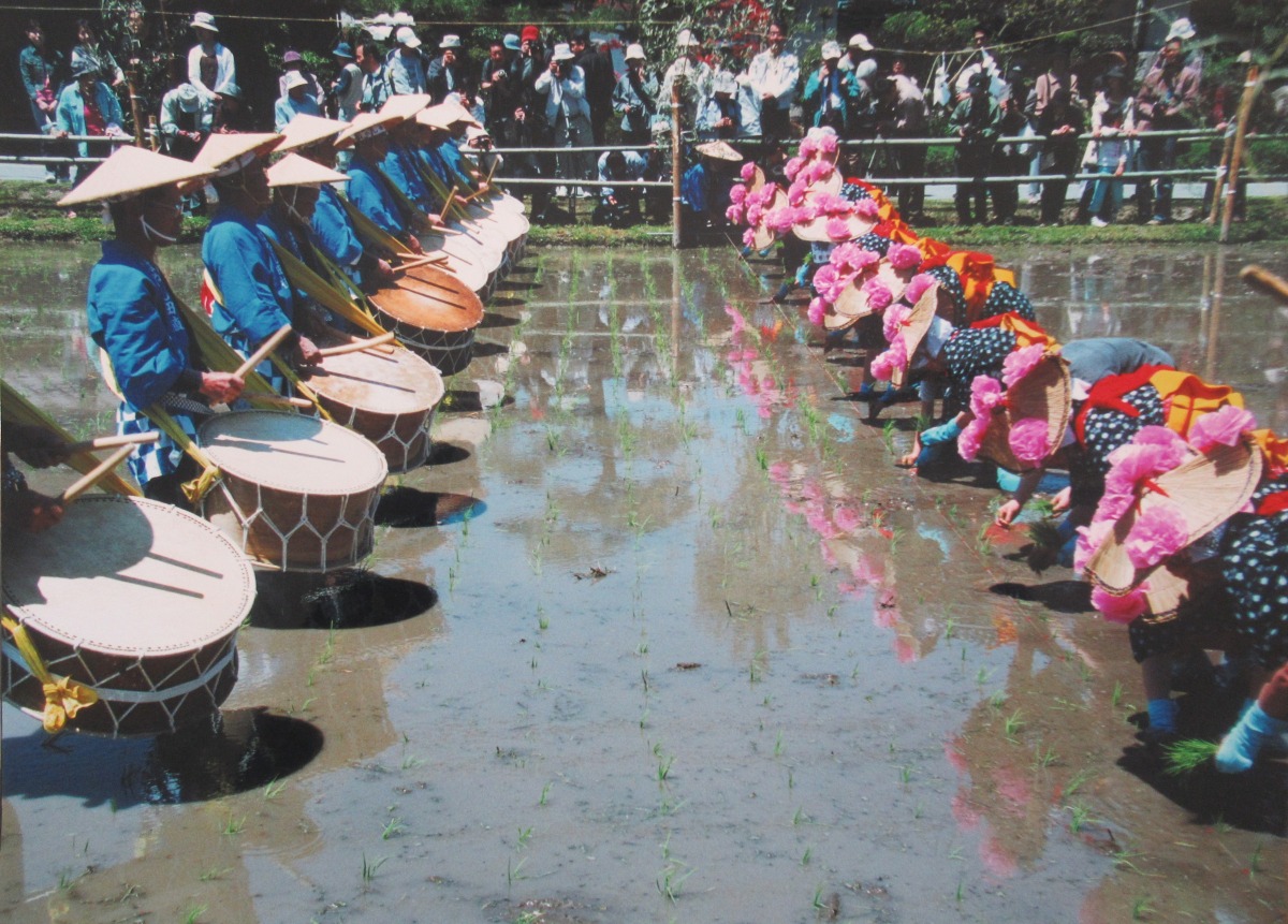 太鼓田植え(太鼓に合わせ、早乙女が一列になって田植をしていきます)