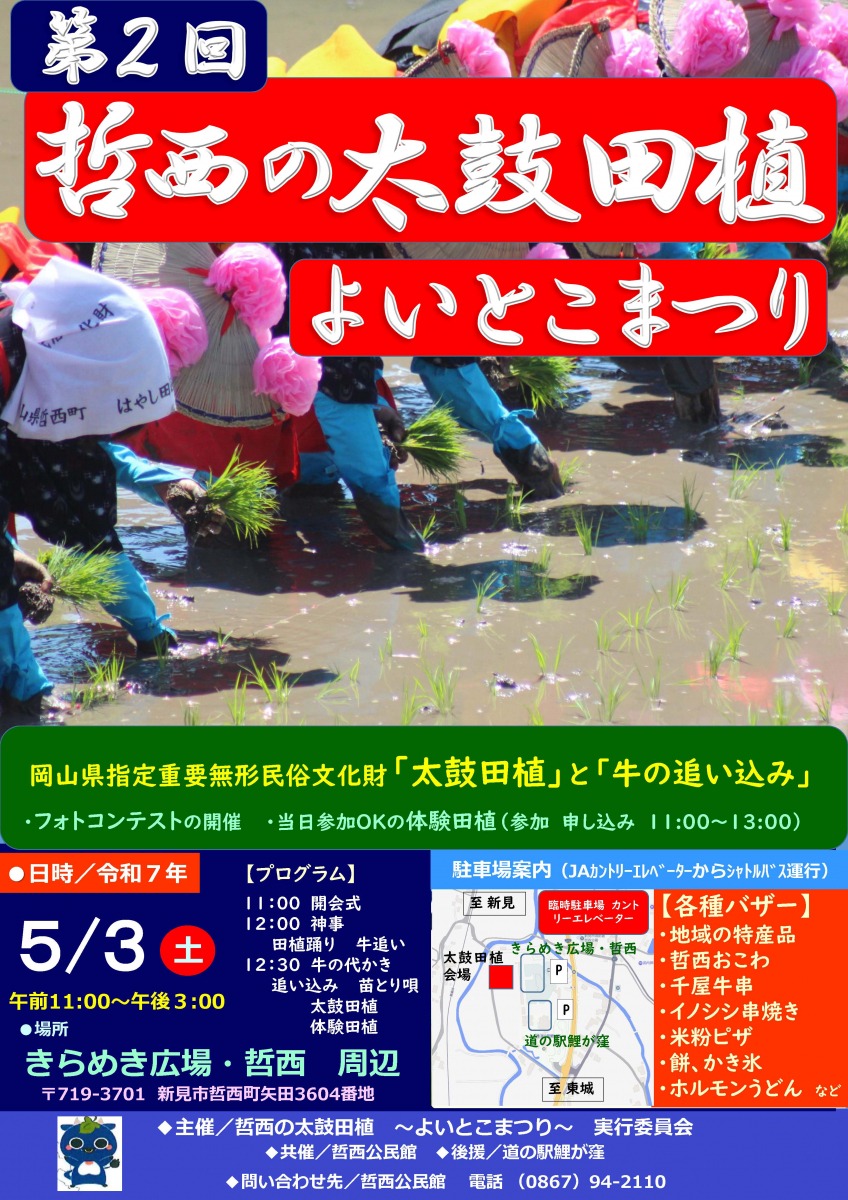 岡山県重要無形民俗文化財に指定されている、新見市哲西町の「太鼓田植」を見学&体験できるイベント。地域の伝統芸能の伝承を目的に生まれた、哲西の新たなおまつりです。当日は、太鼓に合わせて早乙女が一列になって田植をしていく「太鼓田植」や、古くから伝わる牛追い唄に合わせて田で代かきを行う「牛の追い込み」などが見られます。希望者は早乙女に交じって田植え体験も可能です(無料・当日参加可 ※11:00~13:00に申し込み)。ぜひご参加ください。