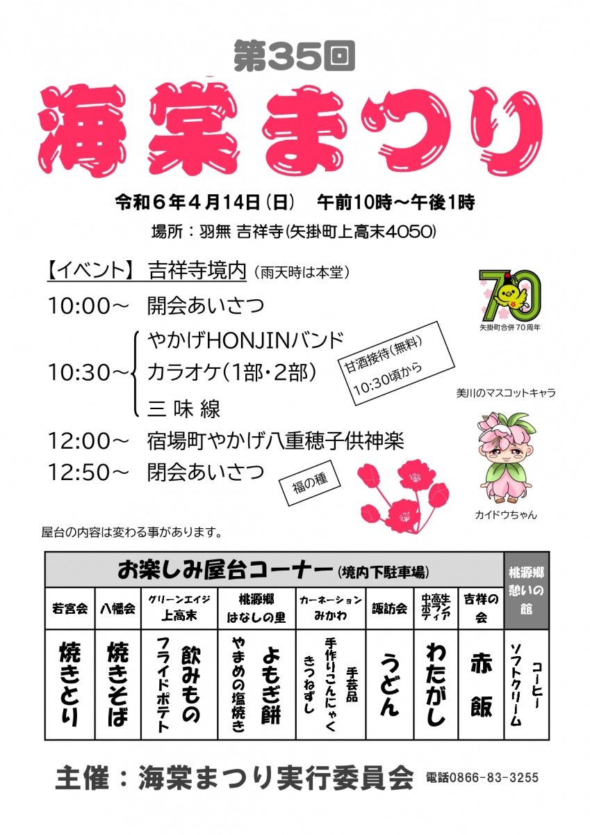 矢掛町北部の谷沿いでは、ゆるやかな斜面に棚田が広がる懐かしい風景に出会えます。そんなのどかな場所にある曹洞宗のお寺「吉祥寺」。ここでは毎年春(4月の第2日曜日)に、淡紅色のかわいい花が咲き誇る「海棠(かいどう)」を楽しむお祭りが開催されます。境内では音楽や子ども神楽などの催しが行われ、駐車場にはたくさんの屋台が並び、地域の皆さんによる温かいおもてなしがお祭りを盛り上げます。