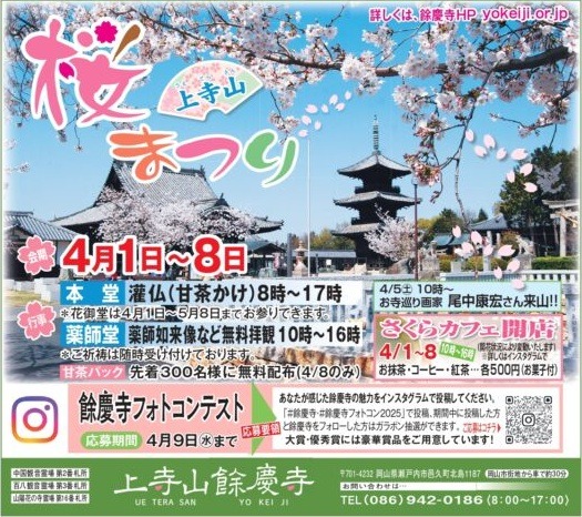 4月8日はお釈迦さまのお誕生日のため、餘慶寺では毎年、同日9:00より降誕会の法要が行われます。また、婦人部によるさくらカフェ等やよけいじマルシェも期間中開催されます。