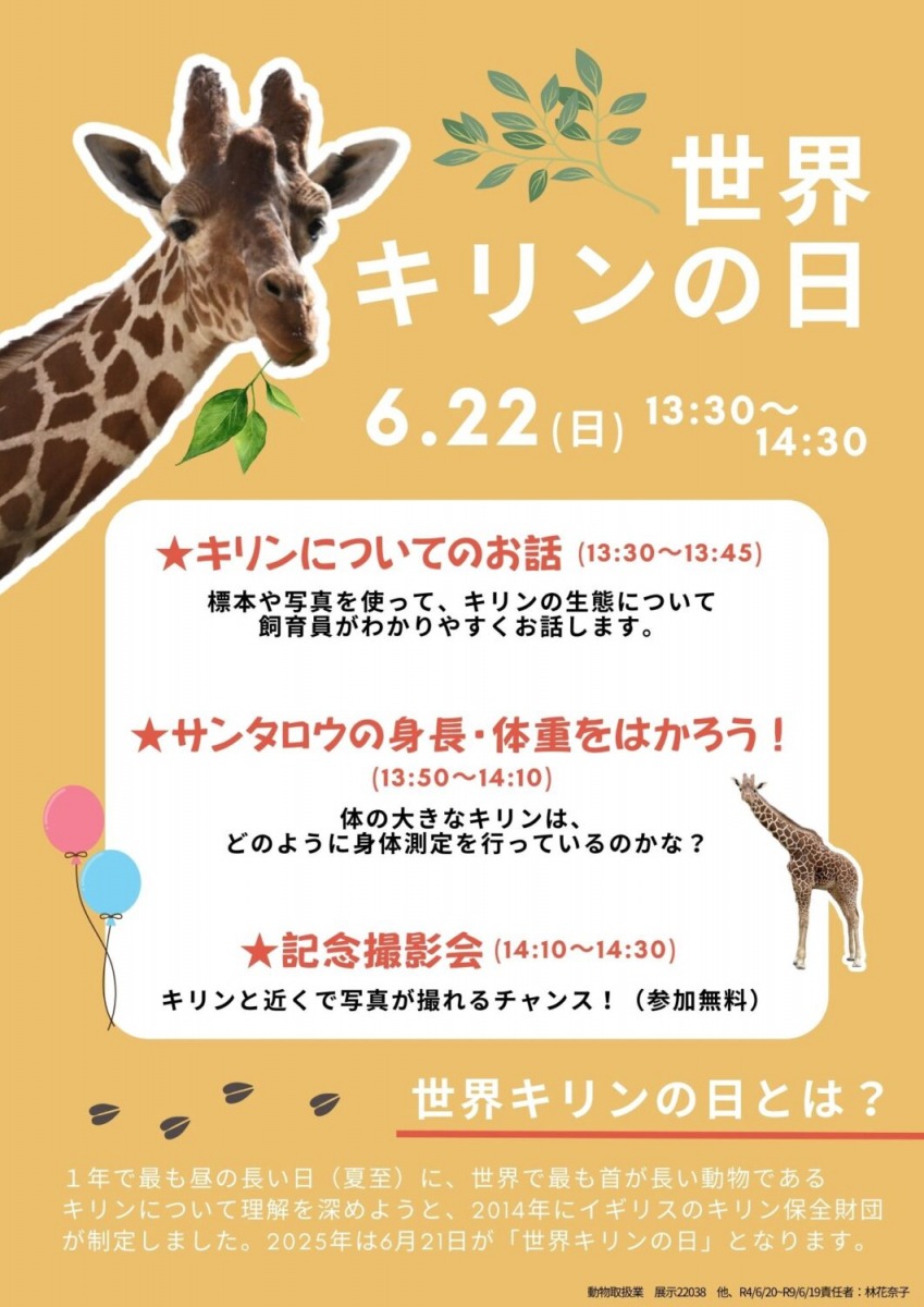 世界キリンの日とは、毎年夏至(1年で最も昼が長い日)に制定されており、世界で最も首が長いキリンについての理解を深めるため、全国の動物園などで様々な啓発活動が行われています。