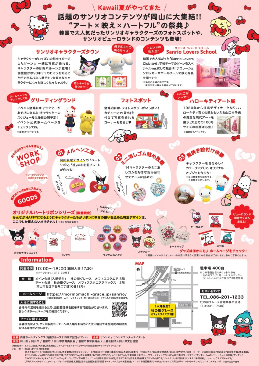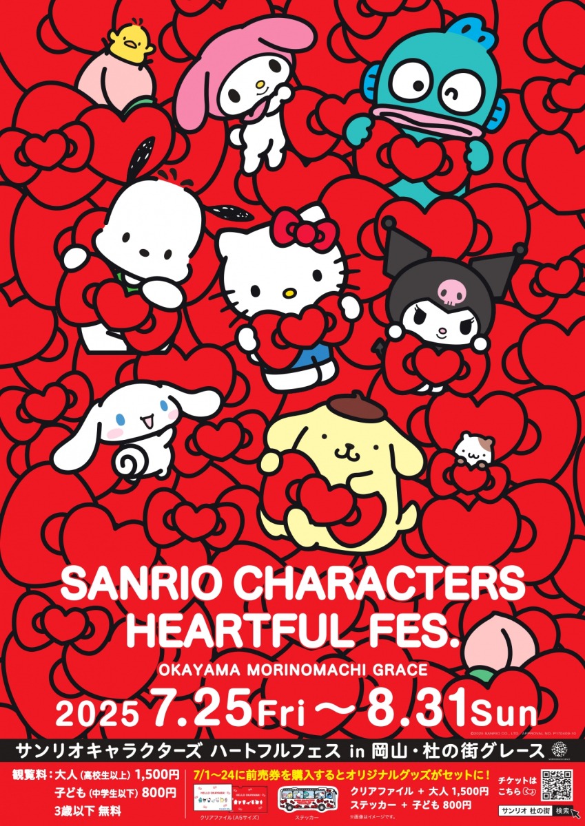 杜の街グレースにて「サンリオキャラクターズハートフルフェス」が開催されます。同展は、両備グループ115周年を記念して開催する特別企画展です。韓国や東京、サンリオテーマパークなど、各地で人気を集めた展示やコンテンツを厳選。ハローキティ担当デザイナー山口裕子氏による貴重な現代アートをはじめ、没入型のフォトスポット、グリーティング、ワークショップ、限定グッズ販売などを一堂に集めました。世代を問わず愛される株式会社サンリオの人気キャラクターたちと、心温まる夏のひとときを楽しめます。
