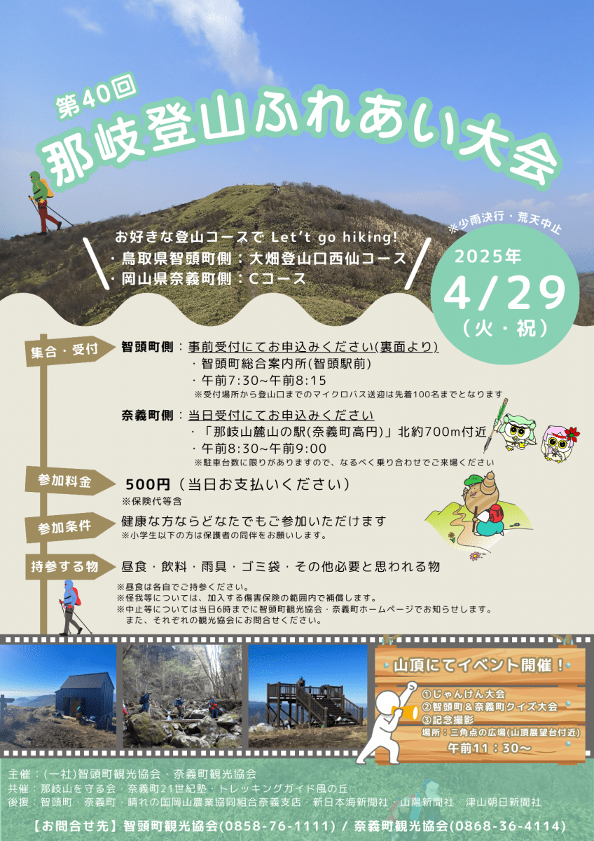 ※中止等については、当日6:00までに奈義町ホームページ等でお知らせ。またそれぞれの観光協会にお問い合わせください。