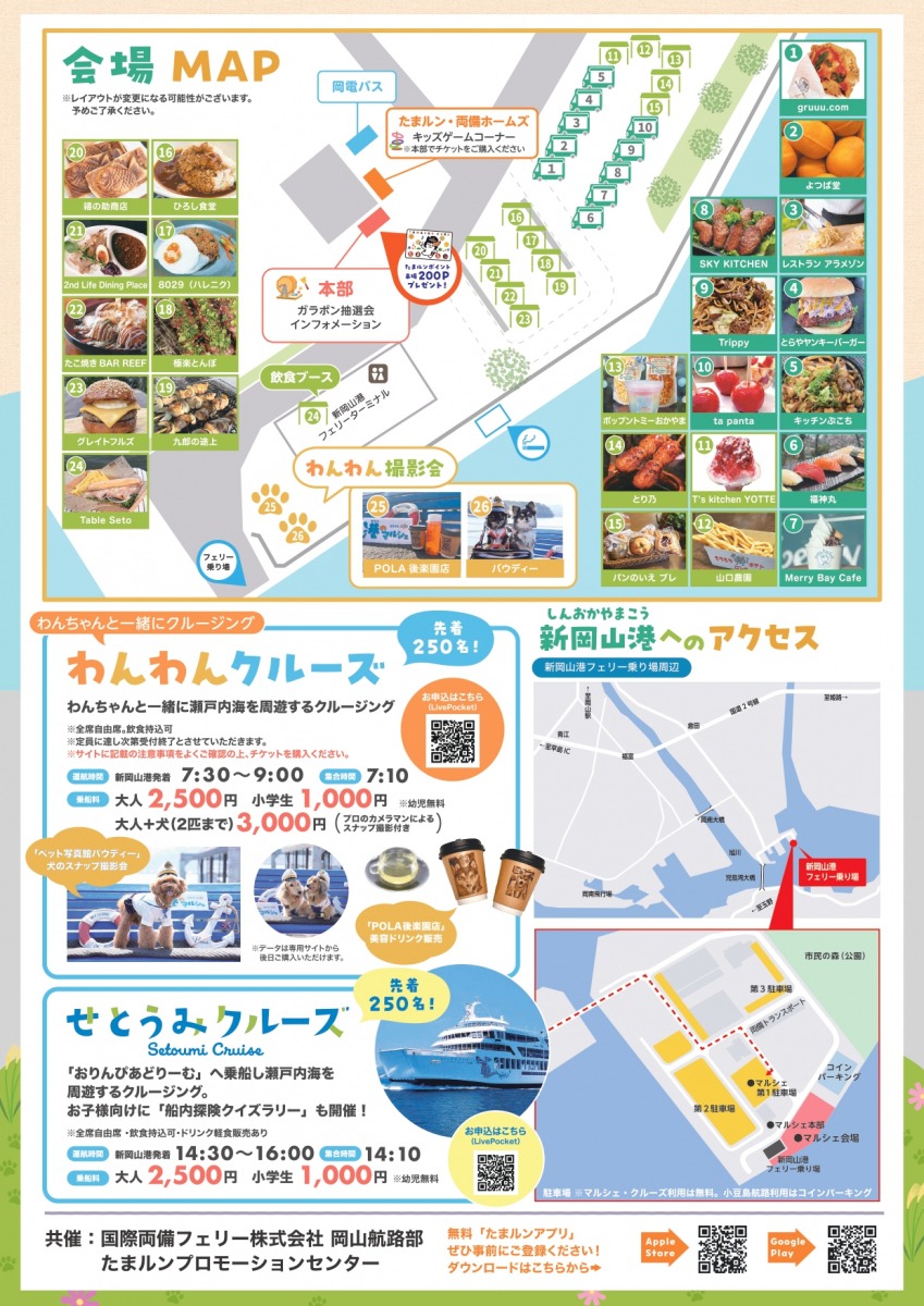 新岡山港で開催されるフードマルシェ。人気のキッチンカーなどが24店舗が出店。ガラポン抽選会やキッズゲームコーナー、おかでんチャギントンバス展示など内容が盛り沢山です。今回は、プロカメラマンによるペットとの「わんわん撮影会」(10:00~15:00※有料)が実施。