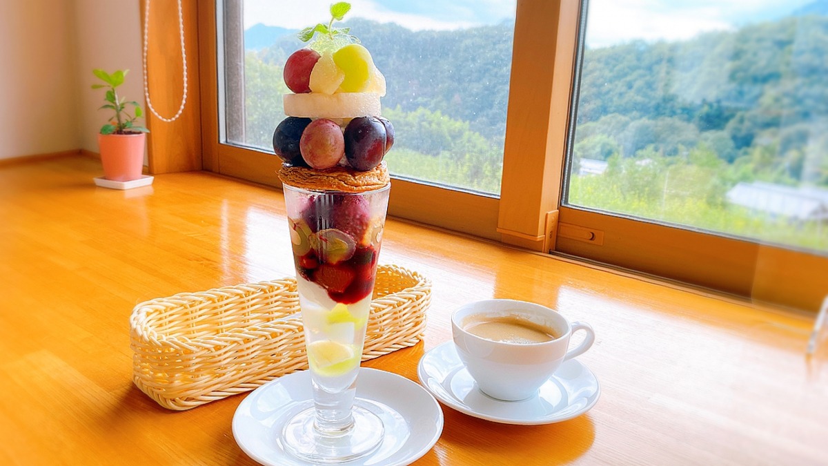 農園のぶどうを摘み取って、そのぶどうを使ったグラスパフェ作りを楽しめる産地ならではの体験できます。カフェのスタッフが