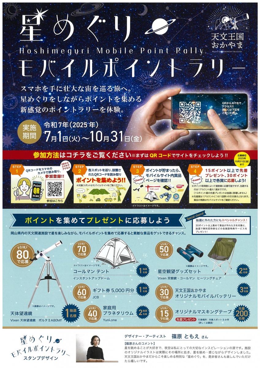 イベントに参加して、岡山県内にある天文に関連した各施設を利用、または天文に関する各種イベントに参加する事で、スマートフォンサイトにポイントを獲得。その獲得数により、オリジナルマスキングテープや天文関連グッズのプレゼント応募することができます。