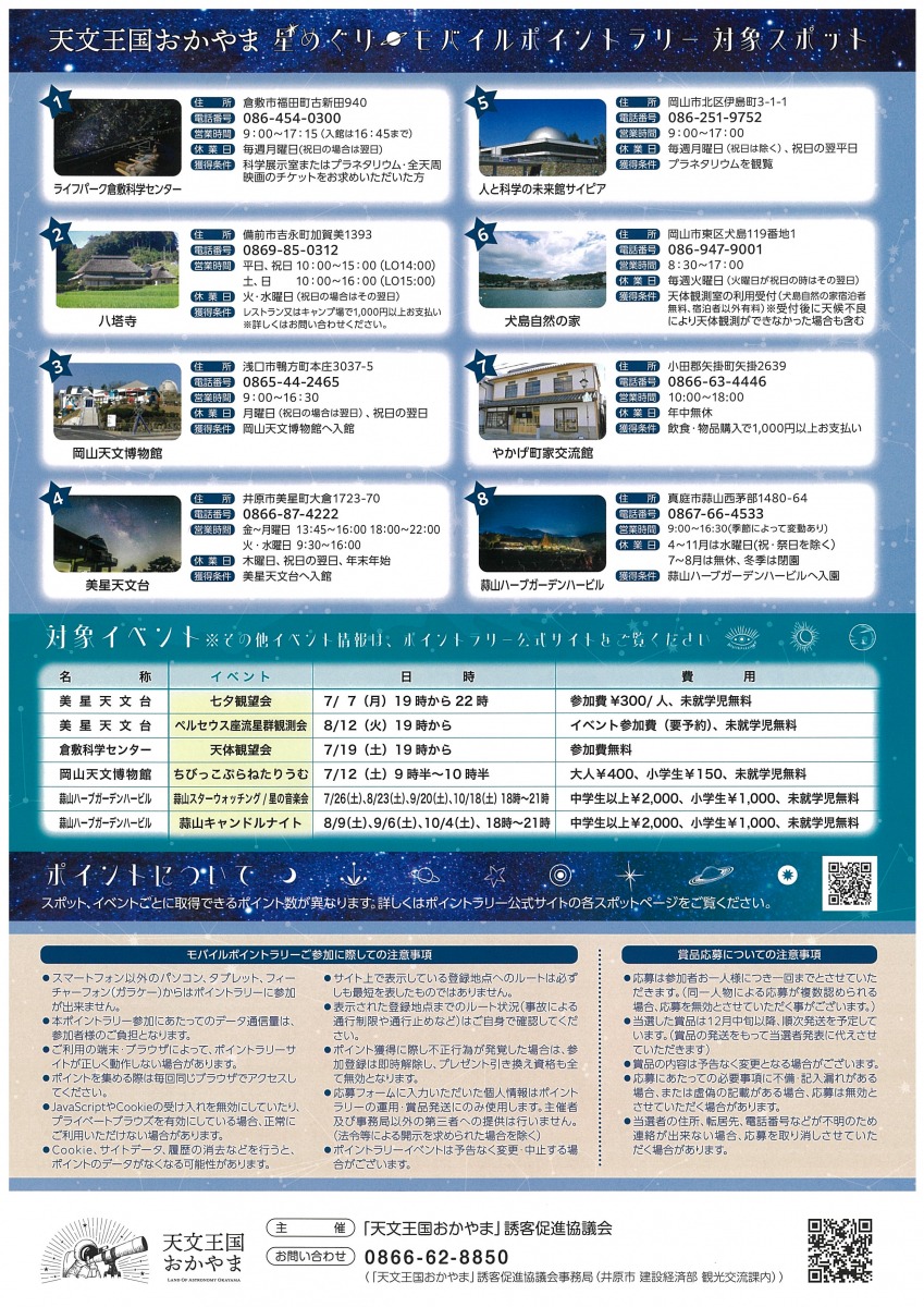 - 0866-62-8850(「天文王国おかやま」誘客促進協議会 事務局)