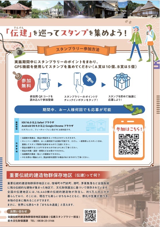 実施期間中にスマートフォンとともに全国129か所の伝建地区を廻り、GPS機能を使用してデジタルスタンプを獲得できます。5個以上スタンプを獲得したら、全国各地の名産品が当たる抽選に応募可能。これを機会に昔ながらの雰囲気を残す全国各地の伝建地区を巡ってみよう!
