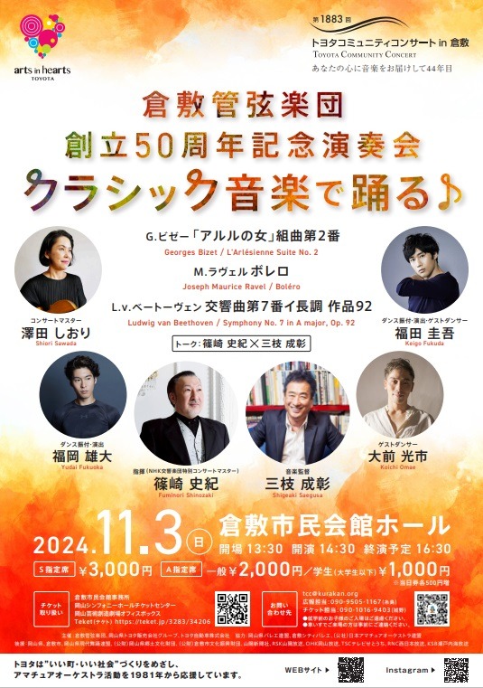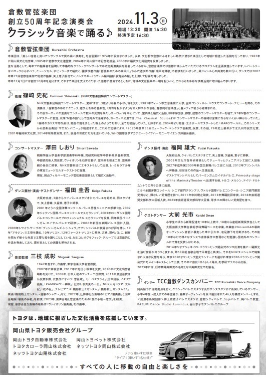 オーケストラ演奏には、コンサートマスターに澤田しおり氏を迎え、指揮者にはNHK交響楽団特別コンサートマスター篠崎史紀氏(愛称:マロさん)を、ティンパニストにはNHK交響楽団首席奏者の植松透氏を迎え、倉敷管弦楽団の50周年記念特別公演です。