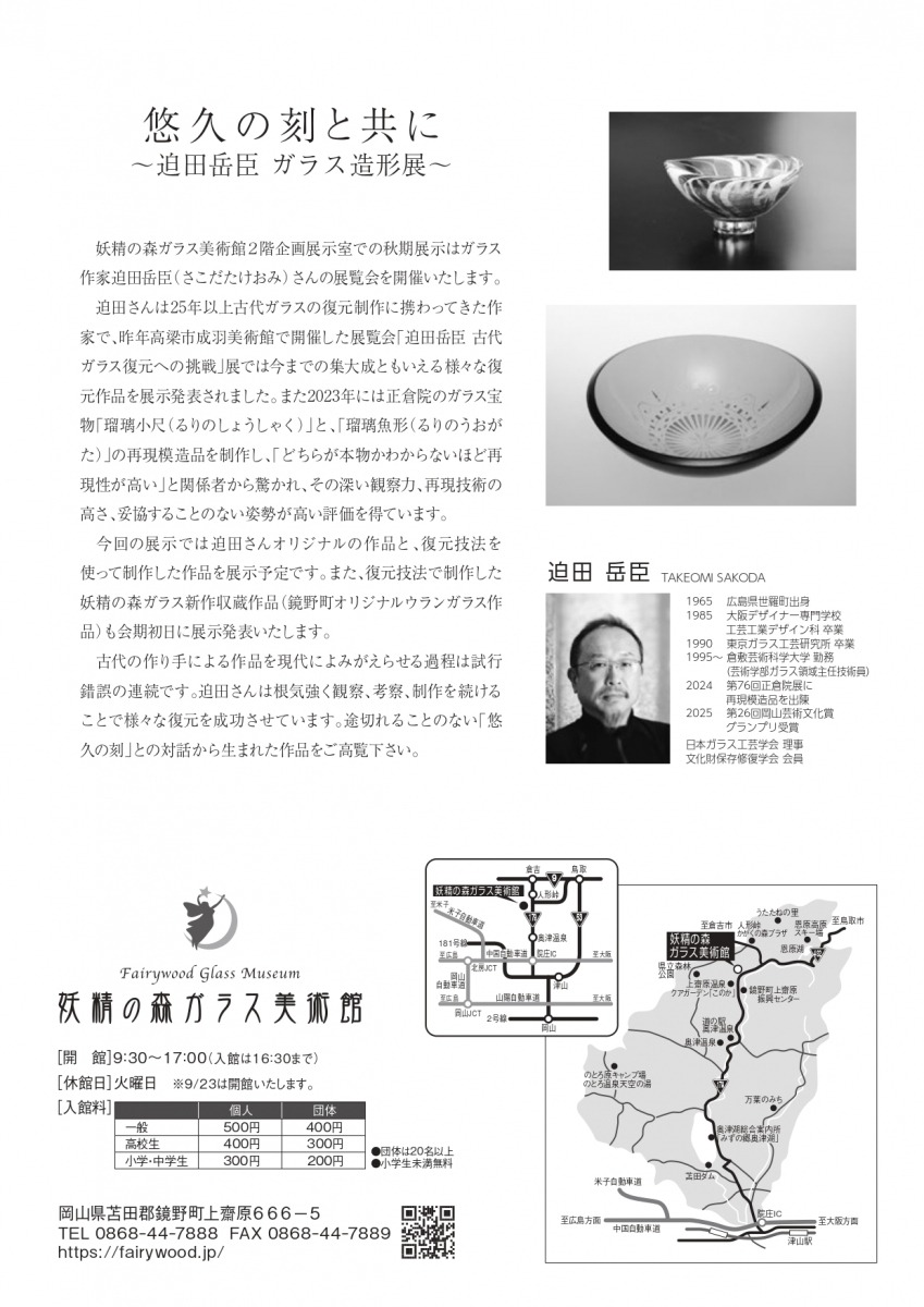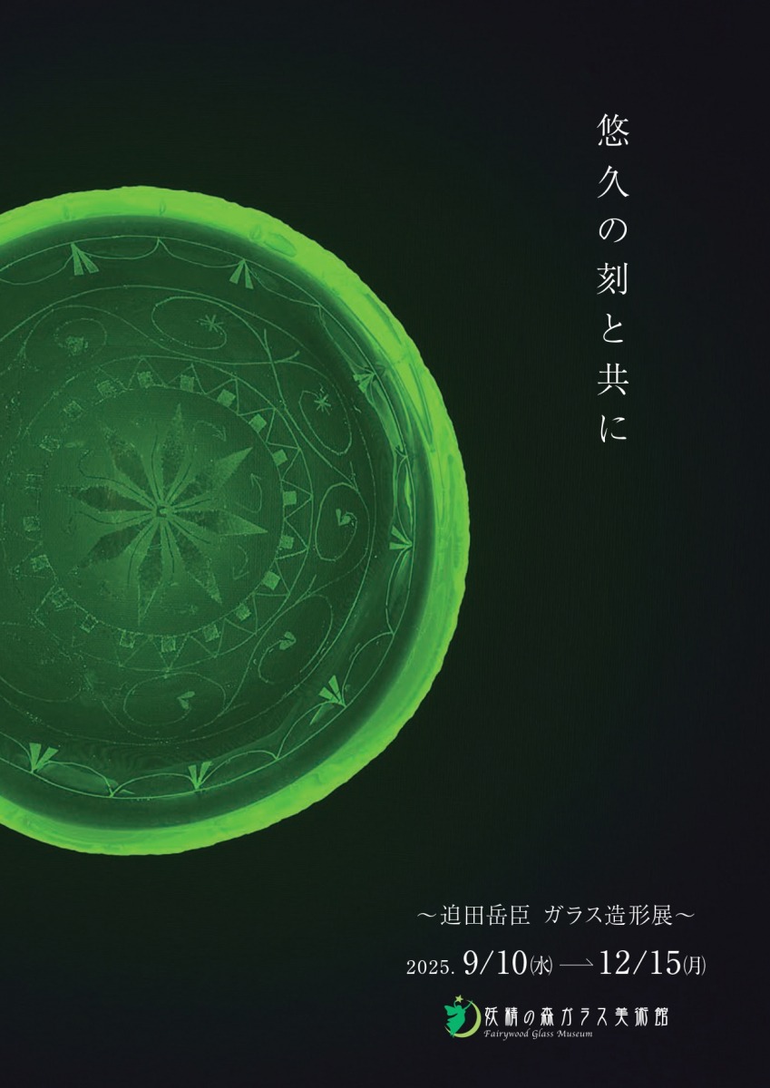 妖精の森ガラス美術館2階企画展示室でガラス作家・迫田岳臣(さこだたけおみ)さんの展覧会が開催されます。