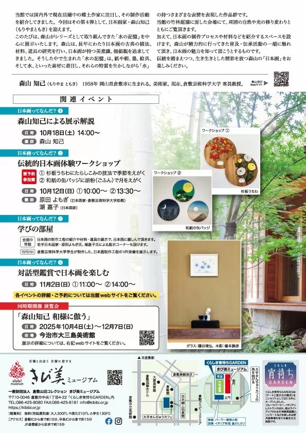 このたびは、森山がシリーズとして取り組んできた「水の記憶」を中心に展示されます。森山は、長年にわたり日本画の古典の描法、材料、道具の研究を行い、日本画が持つ美意識、価値観を追求してきました。そうした取り組みの中で生まれた「水の記憶」は、紙や絹、墨、絵具、そして水、といった素材に着目し、それらの特質を生かしながら「水」の持つさまざまな表情を表現した作品群です。同館の竹林庭園に面した会場にて、周囲の自然や光の移り変わりとともに鑑賞できます。