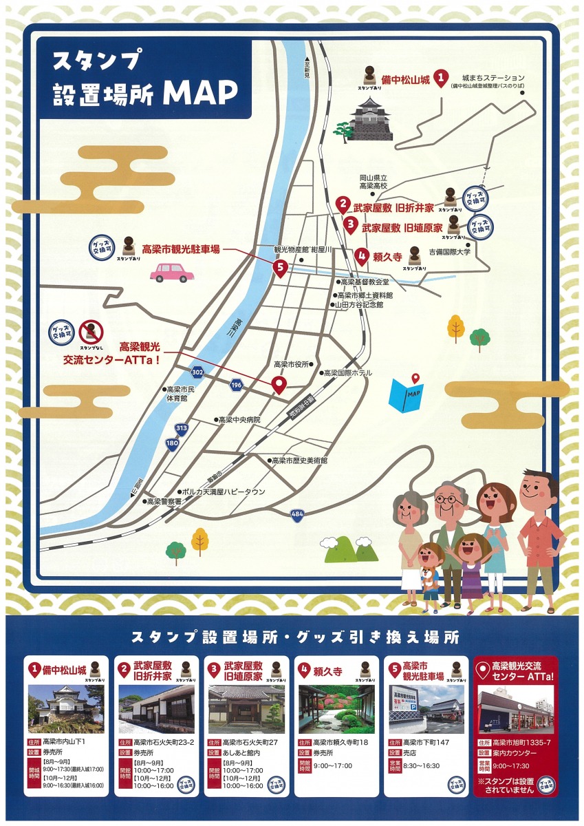 備中松山城、武家屋敷 旧折井家、武家屋敷 旧埴原家、頼久寺、高梁市観光駐車場、高梁市観光交流センターATTa!(グッズ交換のみ)