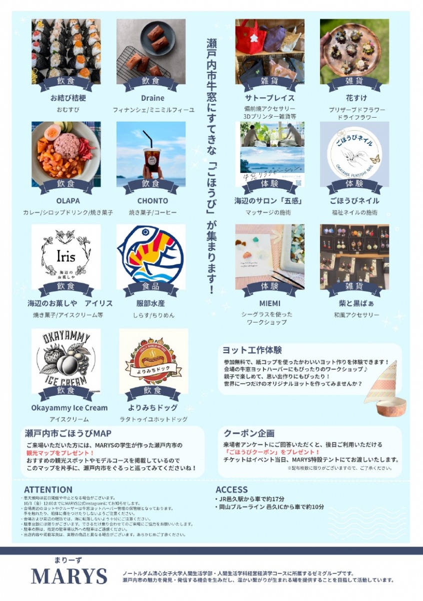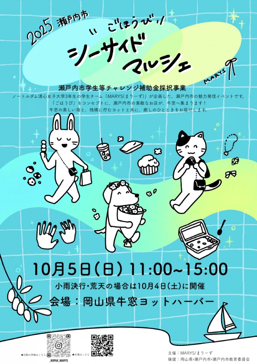 ノートルダム清心女子大学3年生の学生チーム「MARYS(まりーず)」のメンバーが企画する、瀬戸内市の魅力発信イベントが開催されます。