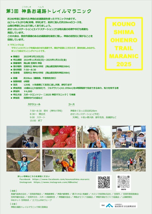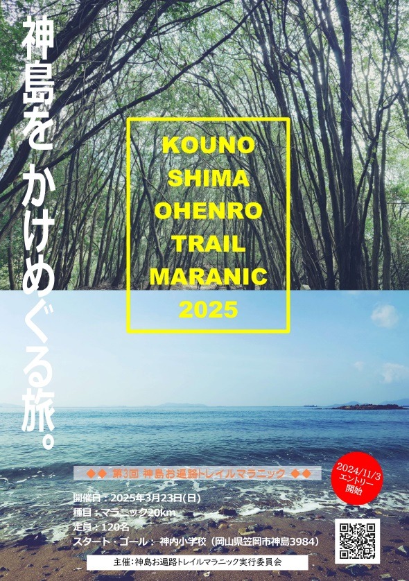 約280年前に開かれた神島のお遍路道を使ったマラニック大会(ランニングイベント)が開催されます。山(トレイル)から海(岩場、砂浜)まで、起伏に富んだ約20kmのコースを山桜の季節にみんなで楽めます。おせったいステーション(エイドステーション)では地元産の名物や手打ち蕎麦が用意されています。歴史的価値のあるお遍路道を後世に残し、神島の活性化に繋がることを目指しているイベントです。