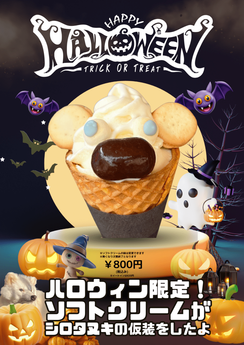 モデルとなったのは、当園で飼育しているホンドタヌキ(白変種)の「こゆき」です!期間限定の可愛いハロウィンソフトです。