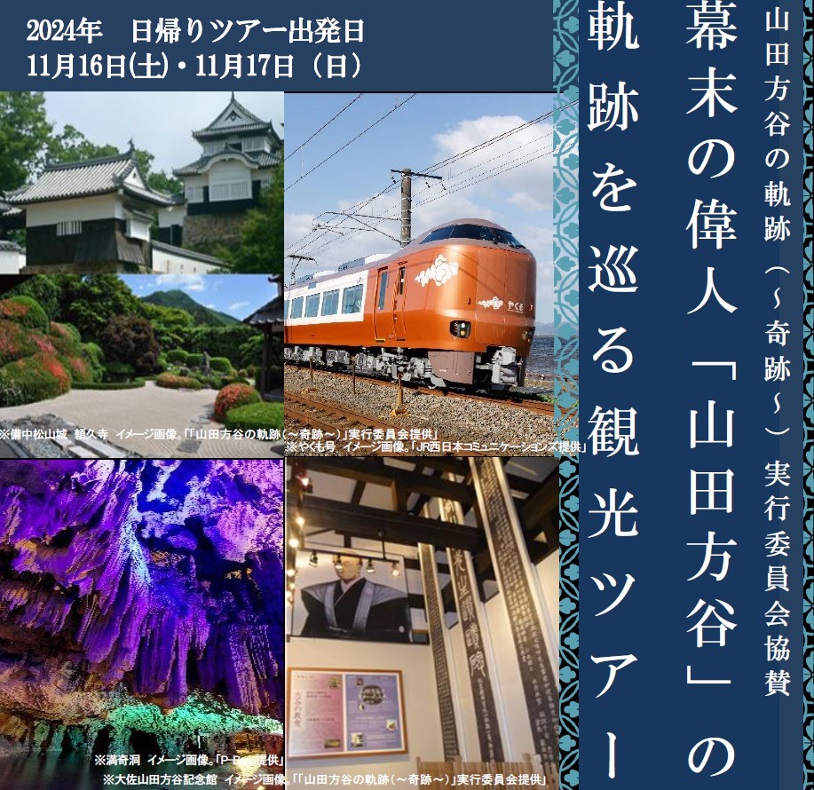観光バスツアーは、新型やくもで行く南北コースで、山田方谷ゆかりの地に加え、現在開催中の「森の芸術祭」会場の一つ満奇洞などを巡るツアーです。