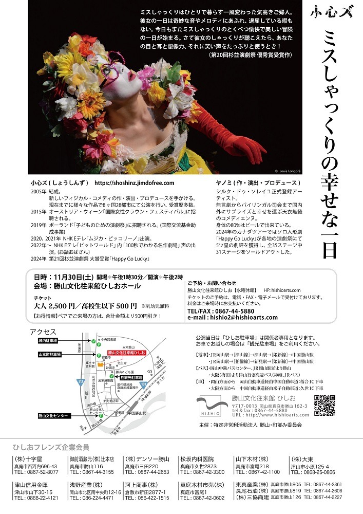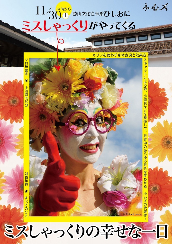 勝山文化往来館ひしおにて、ソロ無言劇「ミスしゃっくりの幸せな一日」が上演されます。この劇は、セリフを使わず身体表現と効果音、スキャットによる歌、小道具などを駆使して、世界中のあらゆる世代を笑わせる、小心ズの代表作です。