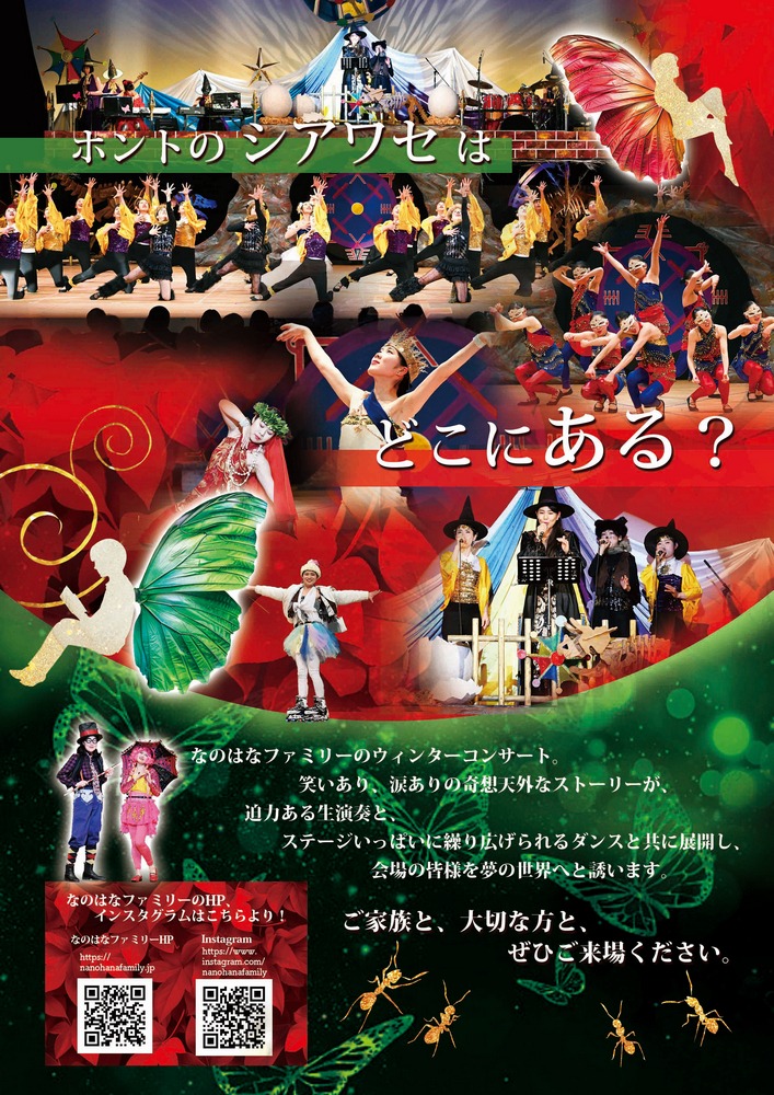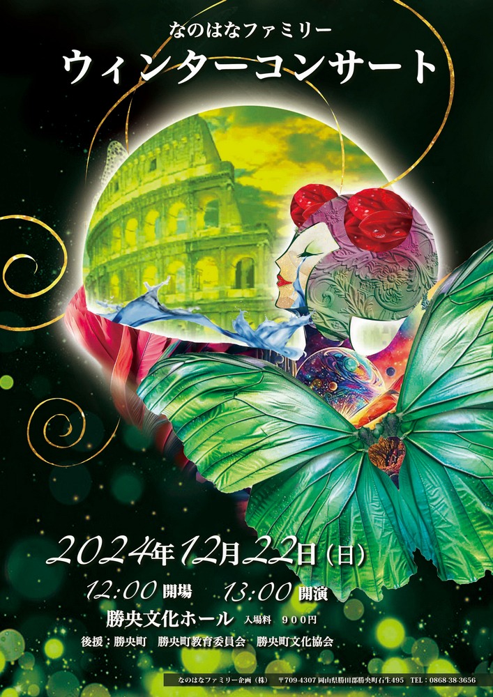 勝央文化ホールにて「なのはなファミリー ウィンターコンサート」が開催されます。総勢60名がロックやポップスなどバンド生演奏に、ダンス・コーラスで繰り広げる音楽劇のステージです。笑いあり涙ありの奇想天外なストーリーが、迫力ある生演奏とステージいっぱいに繰り広げられるダンスと共に展開されます。壮大な舞台背景、引き込まれる演劇、きらびやかな衣装でのステージが楽しめます。