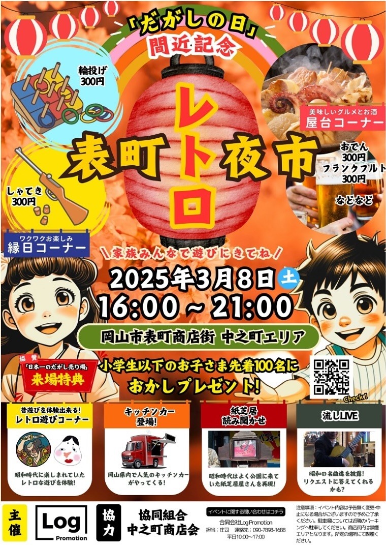 子供達だけでなく商店街で働く方々、岡山を愛してやまないおじさんおばさんにも日頃のお疲れの癒しとして飲んで交流して楽しめる「表町レトロ夜市」が開催されます。「縁日コーナー」には、射的、紙芝居、輪投げが並びます。人気のキッチンカーや美味しいグルメ屋台も並びます。