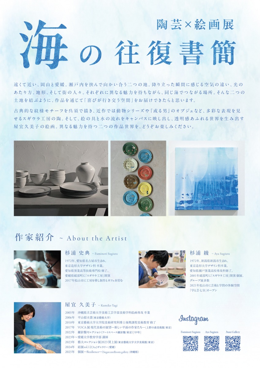 瀬戸内海を挟んで向かい合う岡山と愛媛――空気や光、地形、文化の違いを感じながらも、同じ海でつながる二つの土地。その距離感の中にある豊かな表現を作品という“手紙”で交わし合うように展開する展示です。