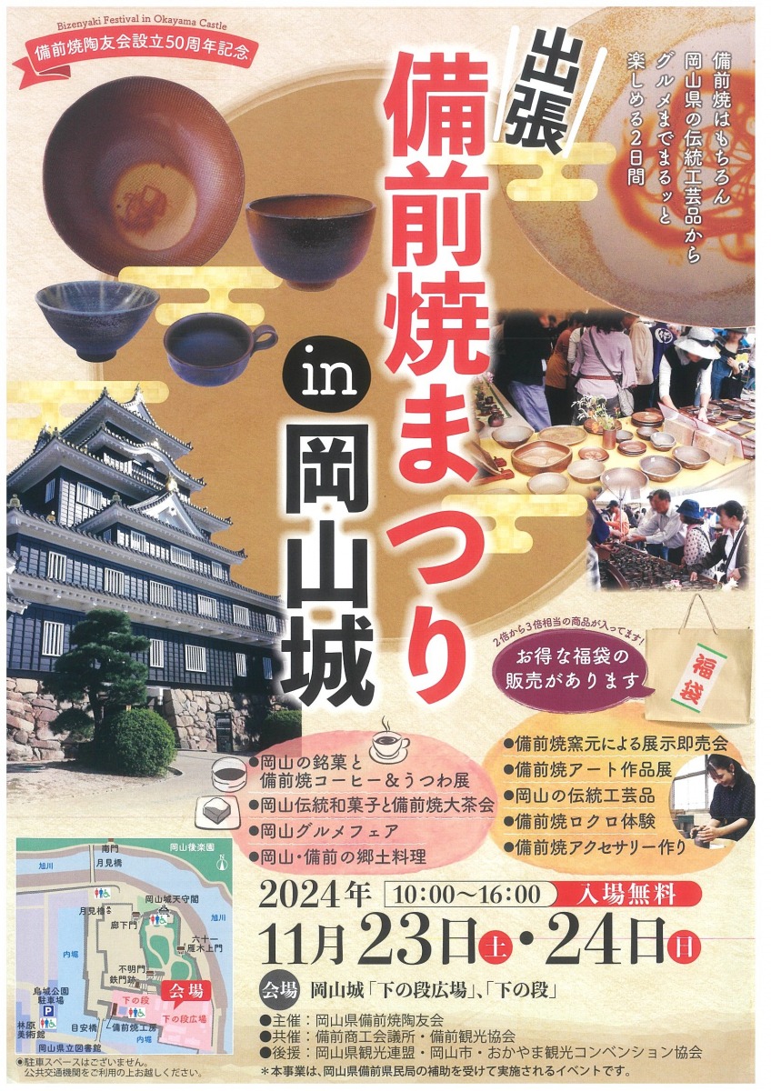 備前焼陶友会設立50周年を記念し、毎年地元の備前市で行われている「備前焼まつり」が岡山城で開催されます。備前焼販売・福袋販売(5,000円・10,000円)・備前焼ろくろ体験・茶会・備前焼カップでのコーヒー飲み比べなど、様々なイベントが楽しめます。