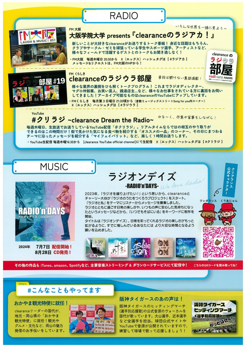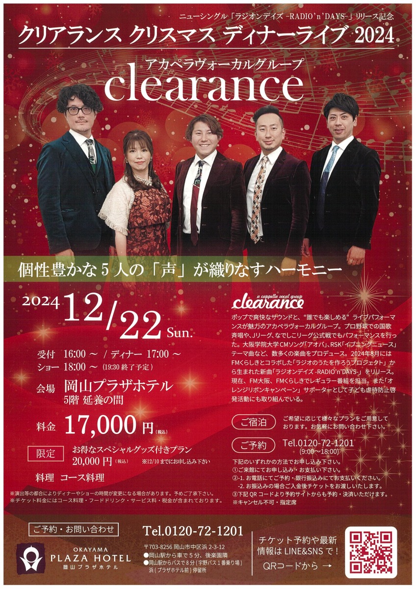 ポップで軽快なサウンドと、"誰でも楽しめる”ライブパフォーマンスが魅力のアカペラヴォーカルグループ「clearance」による、毎年恒例のクリスマスディナーライブ。当日は、2024年8月にFMくらしきとコラボした「ラジオのうたを作ろうプロジェクト」から生まれた新曲「ラジオンデイズ -RADIO’n’DAYS-」も披露される予定です。