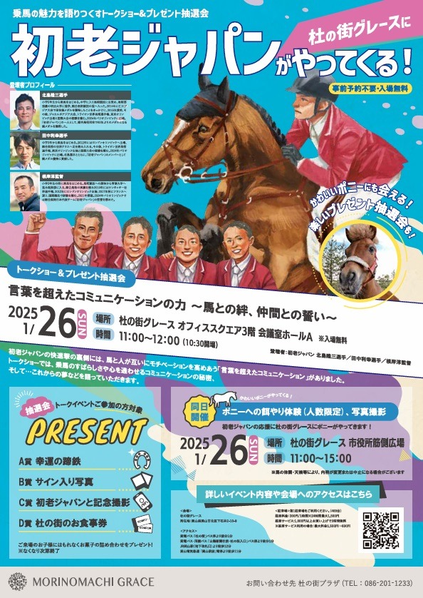 当日は、かわいいポニーが応援にやってきたり、トークショー参加の方限定の抽選会やお子さまへのお菓子のプレゼントもあります。