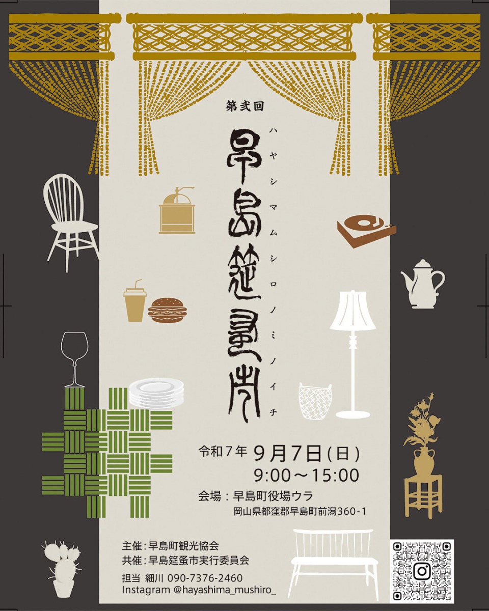 - 086-482-2609(早島町観光協会事務局(早島町役場内)/090-7376-2460(早島筵蚤市実行委員会(担当:細川))
