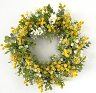 ミモザ、ユーカリを中心にふんわり優しい春色のリースを作成できます。花の咲き具合によって開催日が変更になる場合があります。