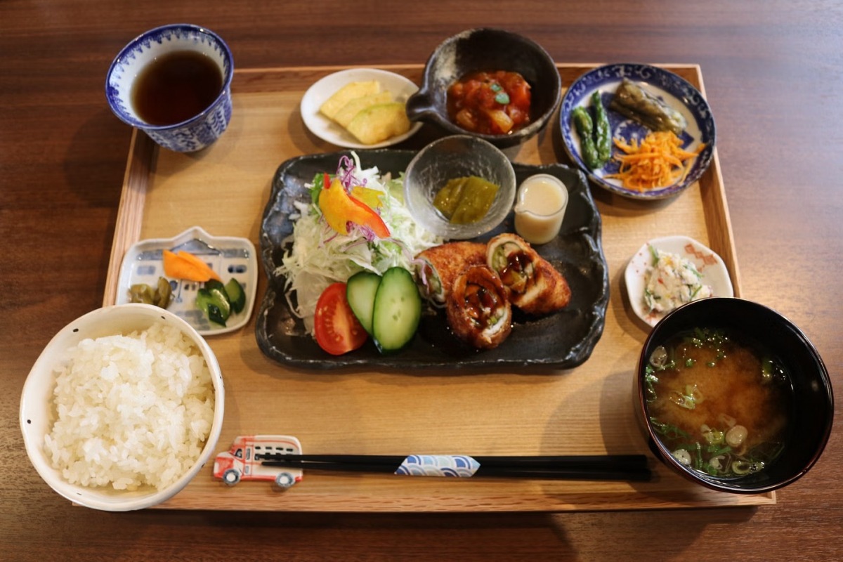 古民家を改装し1棟貸し「町家ステイ吹屋千枚」の1階カフェ燈にて、地元野菜をふんだんにつかったランチをご賞味ください。