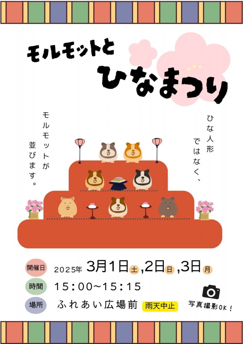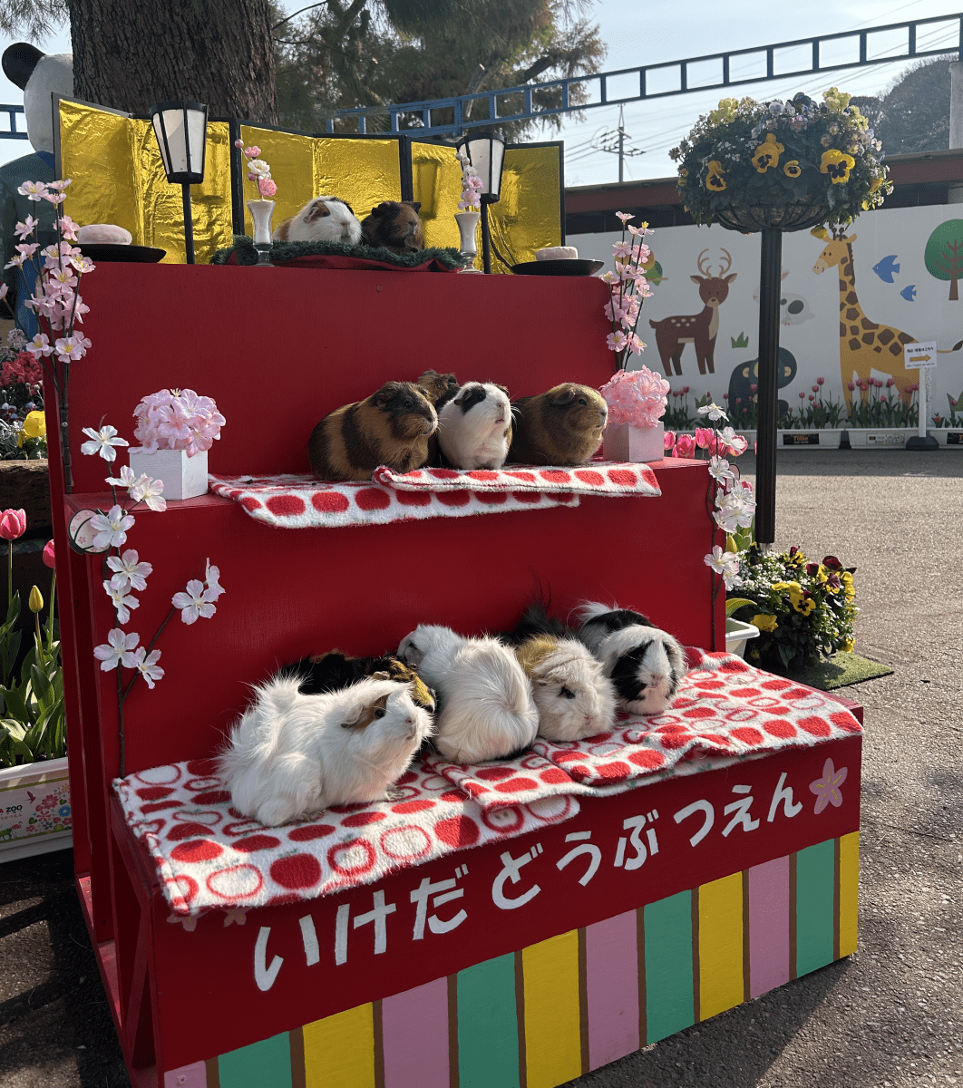 岡山市内中心部からも近い京山にある、全国でもめずらしい山を利用した「池田動物園」にて、ひな祭りにちなんだイベントが開催されます。ひな人形ではなくモルモットたちがひな壇にならびます。可愛らしい姿を楽しめます。